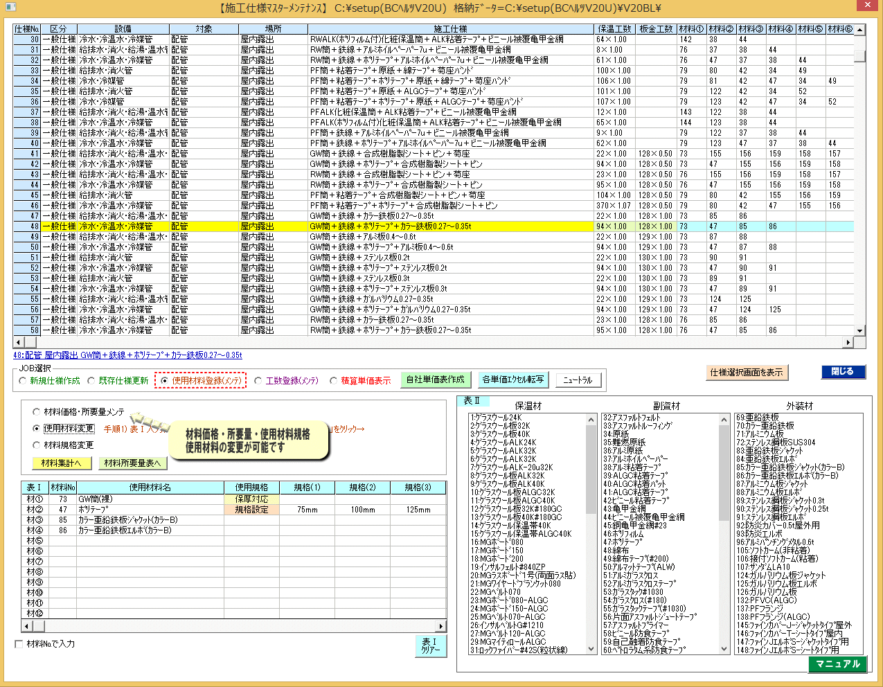 | 使用材料の更新、価格変更、使用規格変更が行えます。 | |||||||||||||||||||||||||||||||||||||||||||||||||||||||||||||||||||||||||||||||||||||