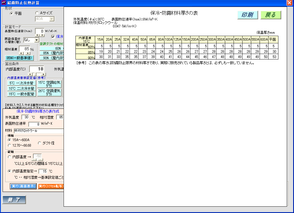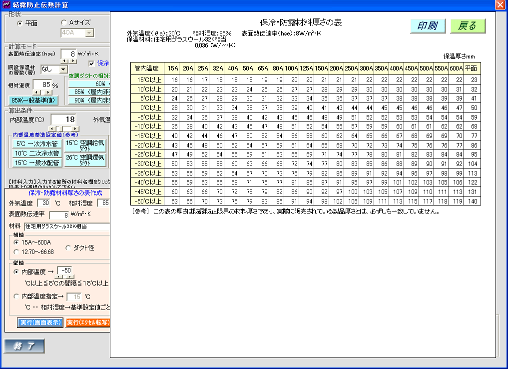 保温(保冷)材料、各条件数値を指示して、管内温度ごとの保冷・防露材料厚さ表を作成