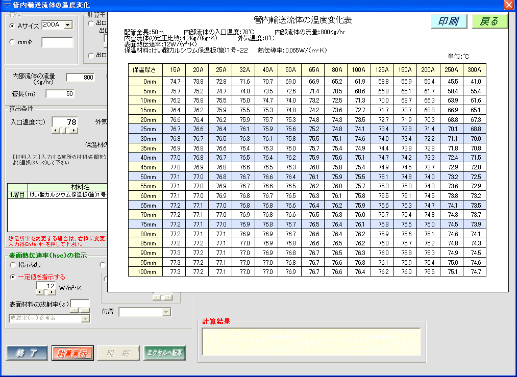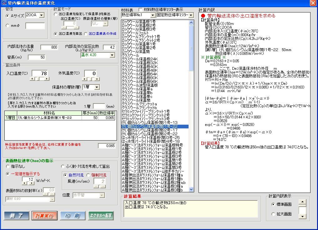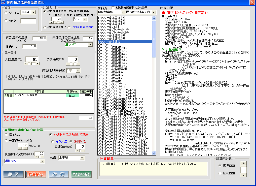 保温材料、各条件数値を指示して、保温厚さごとの管内輸送流体の温度変化表を作成