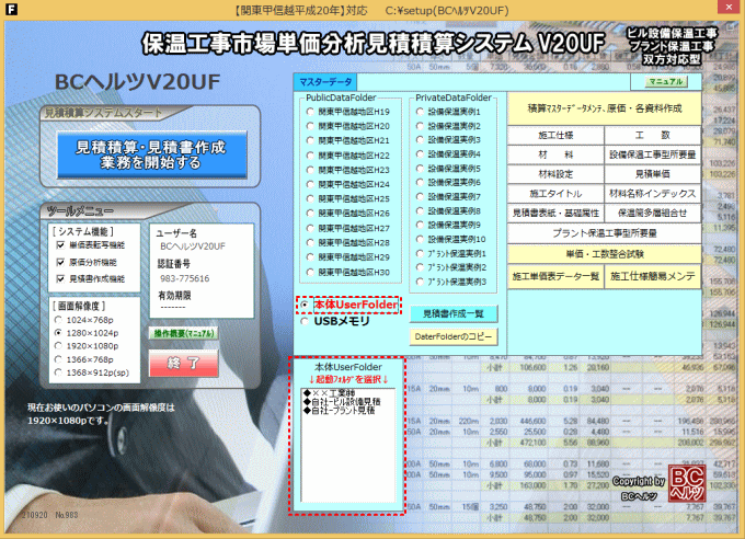 | 見積積算の基礎となるマスターデータ(施工仕様・材料価格・工数・単価表等)を初期登録の「PublicDataFolder」及び「PrivateDataFolder」よりコピーして 自社マスターデータにアレンジして使用する方法があります。 |