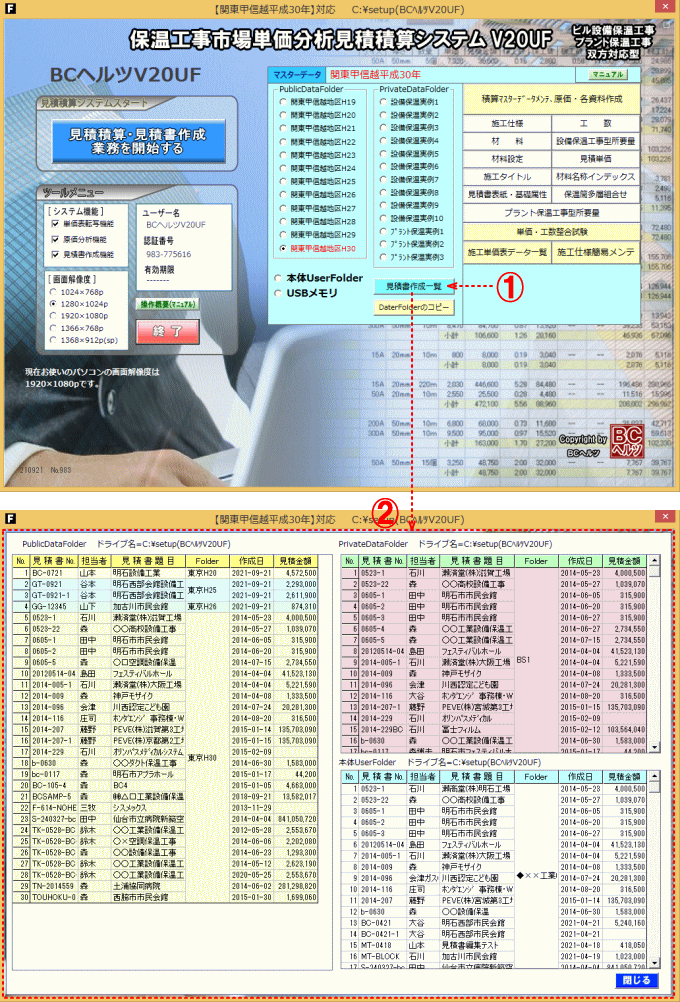 | 【本体内各見積積算フォルダ】 本体内に存在する見積積算各フォルダの内容を一覧表示します。 | |||