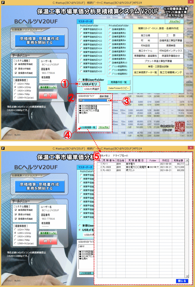 | 【USBメモリ内各見積積算フォルダ】 USBメモリ内に存在する見積積算各フォルダの内容を一覧表示します。 | |||