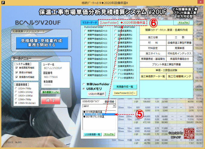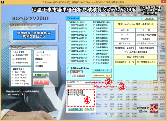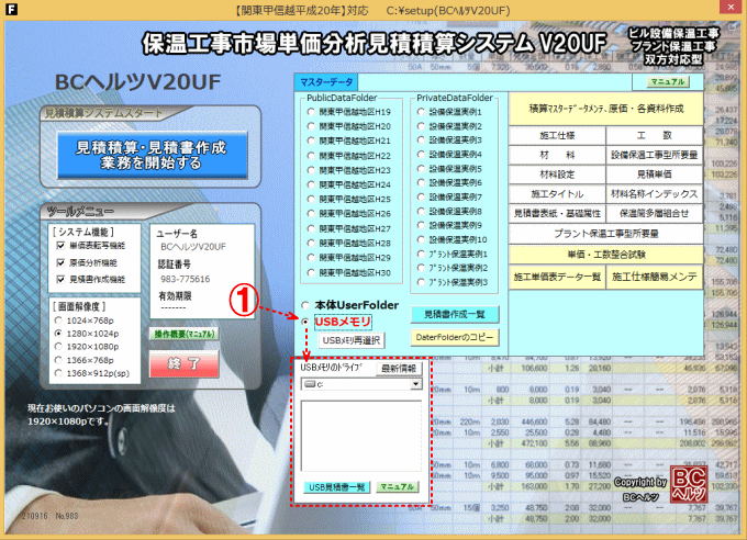 | 見積積算の基礎となるマスターデータ(施工仕様・材料価格・工数・単価表等)及び見積積算データがUSBメモリによる可動も可能となり1台のPCで複数者が個別で マスターデータ、見積積算データの管理が出来ます。 [参考] 積算データ用USBメモリの作り方 |